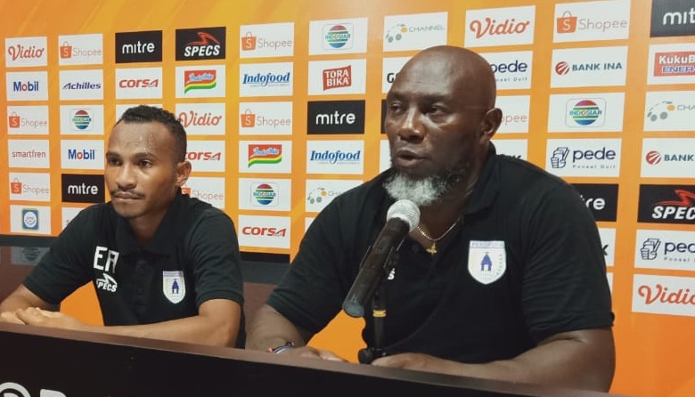 Pelatih Persipura, Jacksen F Tiago di dampingi Pemain Muda Persipura Efraim Awes, saat memberikan keterangan pers usai laga Versus Bali United/ ist
