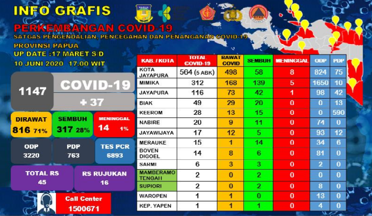 Jayapura, Topikpapua.com, – Jumlah pasien positif covid-19 di Papua terus meningkat, hari ini di laporkan satgas covid-19 Papua ada penambahan 37 kasus pasien positif baru. Total Komulatif pasien positif c-19 di Papua hingga Rabu, 10 Juni 2020 sebanyak 1.147 kasus.