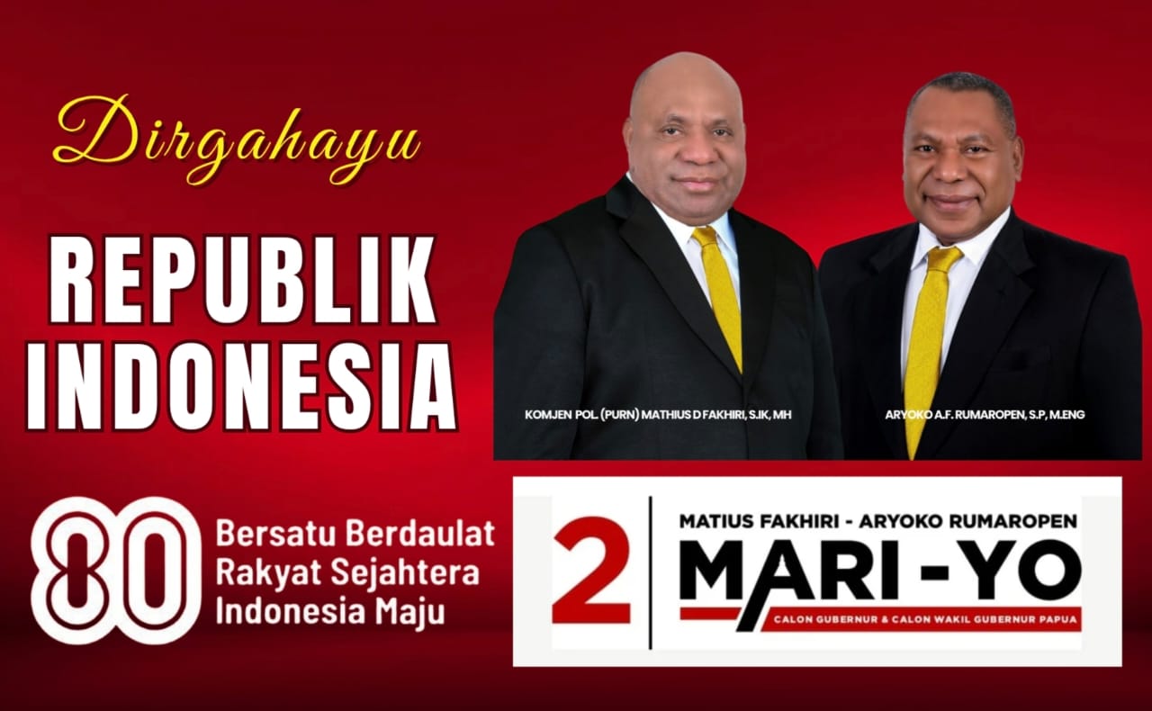“Dan suara itu telah menjelma menjadi hadiah kemerdekaan: Sebuah harapan baru menuju Papua CERAH. Pasangan MARIYO hadir bukan untuk kelompok, bukan untuk golongan, tetapi untuk seluruh rakyat Provinsi Papua. Mereka akan memimpin dengan hati yang menyatu dengan rakyat, menghadirkan pembangunan yang merata, perdamaian dan kesejahteraan yang nyata,” beber Rifai.