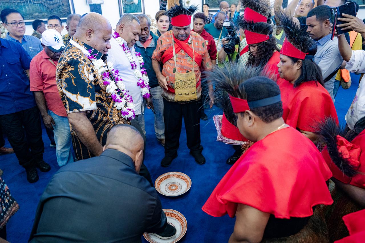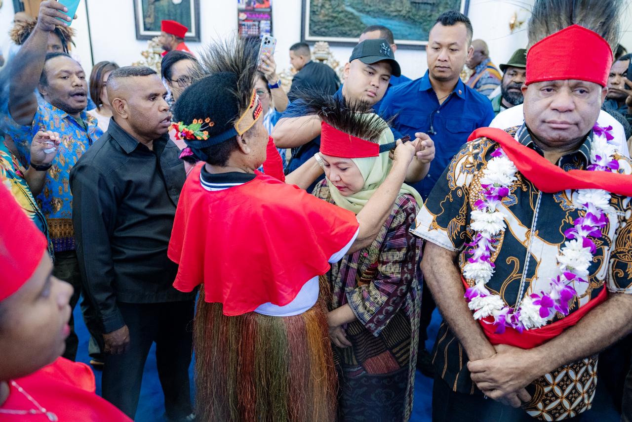 Tiba di Bandar Udara VIP Sentani, Gubernur dan Wakil Gubernur Provinsi Papua, disambut dengan penyematan mahkota dan kalung yang dihiasi pernak-pernik tradisional khas Papua oleh masyarakat.